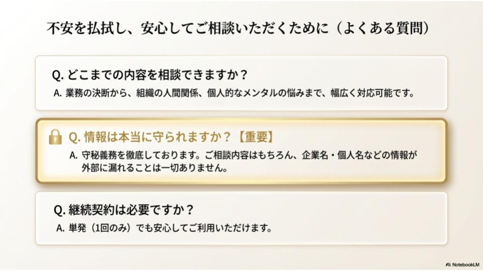 - Q. 本当に効果はありますか? A. 視点が変わり、意思決定が明快になります。得られた気づきを「実際の行動」に移すことが、確かな結果を生みます。